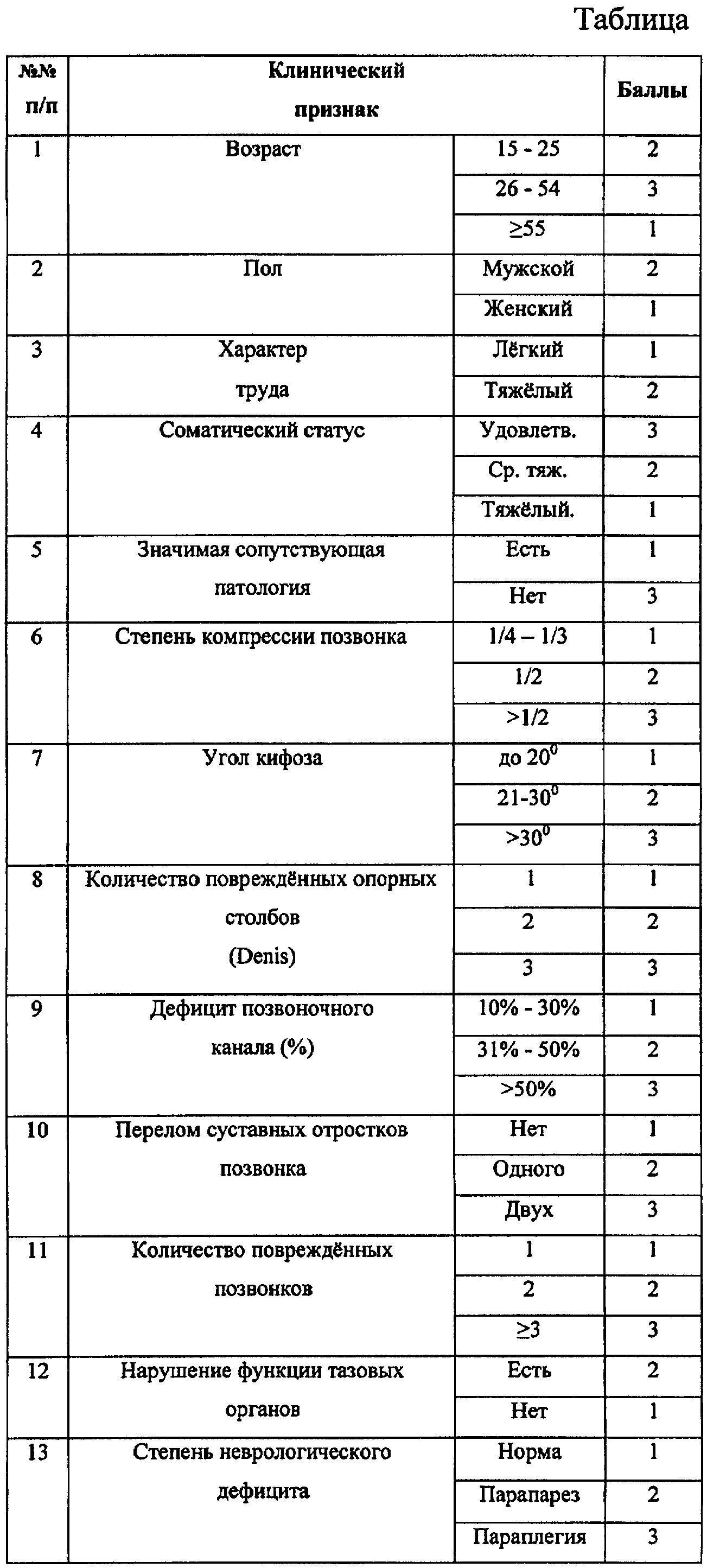 Способ выбора метода хирургического лечения больных с повреждениями переходного грудопоясничного отдела позвоночника, включающий определение параметров, характеризующих состояние пациента: степень компрессии позвонка, угол кифоза, степень неврологического дефицита и последующий математический расчет интегрального показателя, отличающийся тем, что дополнительно определяют возраст, пол, соматический статус, значимую сопутствующую патологию, количество поврежденных опорных столбов, дефицит позвоночного канала, перелом суставных отростков позвонка, количество поврежденных позвонков и нарушение функции тазовых органов, оценивают вышеуказанные параметры следующим образом: