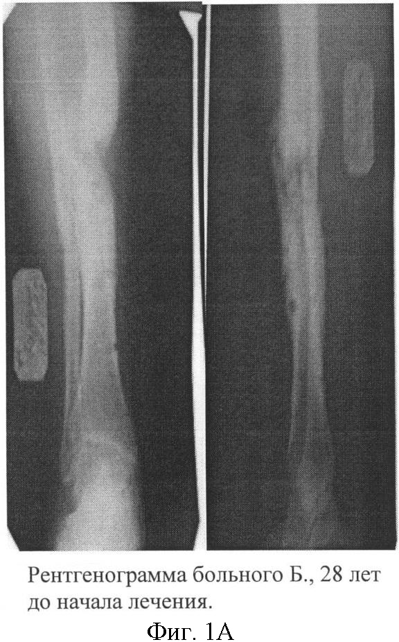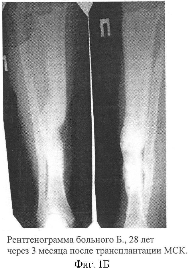 Больной Б., 28 лет, находился на лечении в хирургическом отделении МУЗГКБ 2 с диагнозом: «Хронический посттравматический остеомиелит левой большеберцовой кости в средней трети, свищевая форма; ложный сустав с дефектом костной ткани в средней трети левой большеберцовой кости». Из анамнеза: травма 3 года назад – открытый оскольчатый перелом костей левой голени в средней трети. При поступлении выполнен металлоостеосинтез. Послеоперационный период осложнился развитием остеомиелита. Неоднократно проводились санирующие операции и реостеосинтез, костная аутопластика без эффекта. У больного сохранялся свищ с гнойным отделяемым, больной передвигался с использованием костылей без опоры не конечность. Рентгенологически признаки ложного сустава (фиг.1А). 20.09.07 г. выполнена операция – иссечение свища, некрсеквестрэктомия, дренирование остеомиелитического очага. Иммобилизация гипсовой повязкой. После купирования признаков острого воспалительного процесса выполнены последовательные трансплантации МНК и МСК по описанной схеме. Послеоперационная рана зажила первичным натяжением, признаков воспалительного процесса за период наблюдения не было. Через 3 месяца после имплантации, клинически перелом консолидировался, гипсовая повязка снята. На контрольной рентгенограмме: выраженная костная мозоль по внутренней поверхности средней трети левой большеберцовой кости. Периостальная реакция не отмечается (фиг.1Б). В течение 6 месяцев признаков обострения остеомиелита не было. Больной ходит, не используя дополнительные средства опоры.