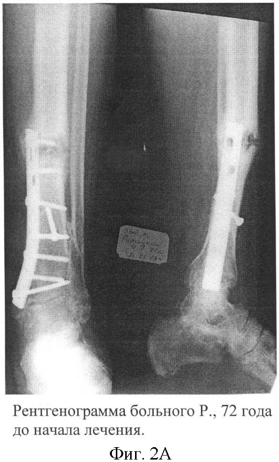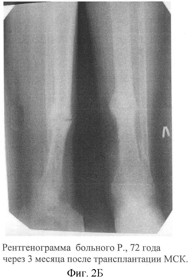 Больной Р., 72 года, поступил в хирургическом отделении МУЗГКБ 2 с диагнозом: «Хронический посттравматический остеомиелит левой большеберцовой кости в средней трети, свищевая форма; патологический перелом с признаками ложного сустава в средней трети левой большеберцовой кости, в условиях ОМС (пластина с шурупами)». Травма 2.5 года назад – закрытый перелом костей левой голени в нижней трети. После накостного остеосинтеза развился остеомиелит. Проводимые лечебные мероприятия привели к консолидации перелома в нижней трети, но у больного сохранялся свищ с гнойным отделяемым и остеомиелитический процесс перешел в среднюю треть большеберцовой кости, где на уровне проксимального шурупа произошел патологический перелом (фиг.2А). Больной передвигался с помощью костылей без опоры на больную конечность. 24.02.08 г. выполнена операция – иссечение свища, удаление металлоконструкции, некрсеквестрэктомия, дренирование остеомиелитического очага. Иммобилизация гипсовой повязкой. Купировав острый воспалительный процесс, выполнены трансплантации МНК и МСК по описанной схеме. Отмечено заживление послеоперационной раны первичным натяжением, без признаков рецидива воспалительного процесса за период наблюдения. Через 3 месяца после имплантации: клинически перелом консолидировал, гипсовая повязка заменена на съемную гильзу. На контрольной рентгенограмме отмечается выраженная костная мозоль в области перелома средней трети большеберцовой кости. Периостальная реакция не отмечается (фиг.2Б). Больной ходит, используя трость с опорой на пораженную конечность. Данная картина сохраняется через 6 месяцев.