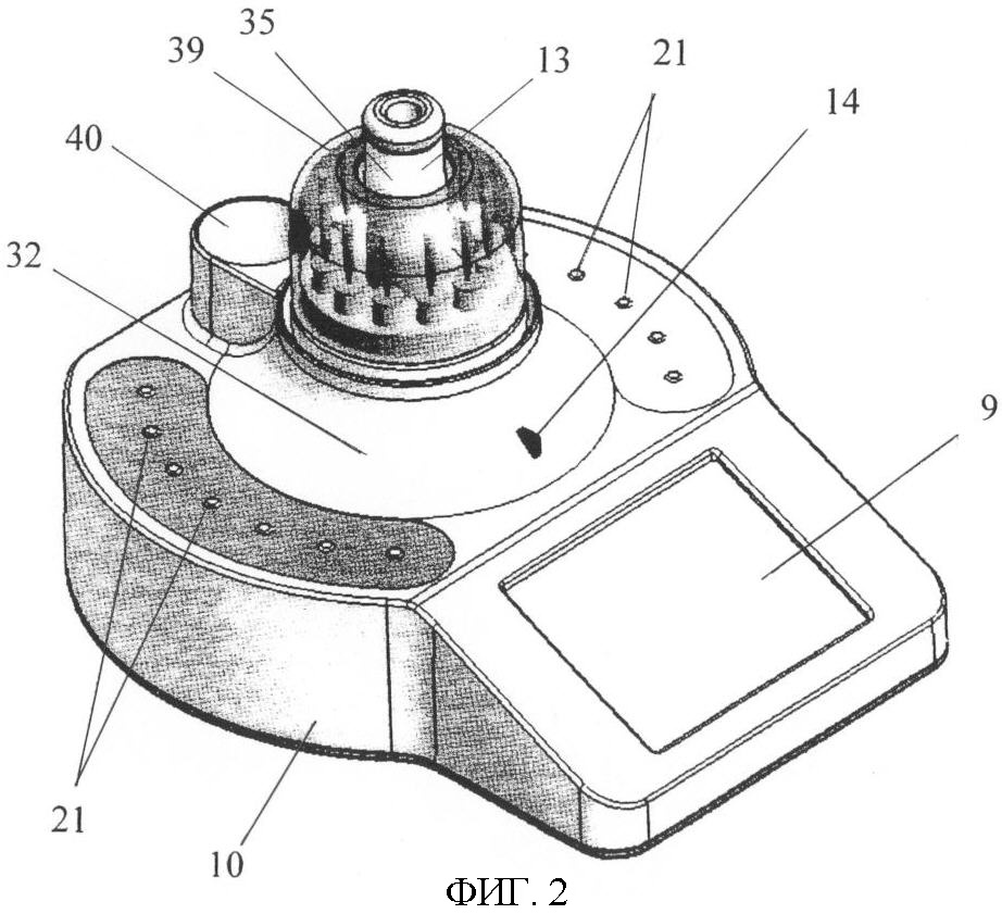 Механическая часть заявленного устройства содержит средство 7 подачи инструмента, которая включает корпус 10, поворотную платформу 11 с приводом 12, смонтированную с возможностью вращения вокруг вертикальной оси, средство 13 временного закрепления инструментов, установленное с возможностью съема на платформе 11 (фиг.2, 3, 4, 5, 6). Место 6, из которого лечащий человек берет инструмент, обозначено расположенным на корпусе 10 светодиодом 14, подключенным к блоку управления 8 и выполненным многоцветным.