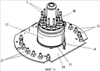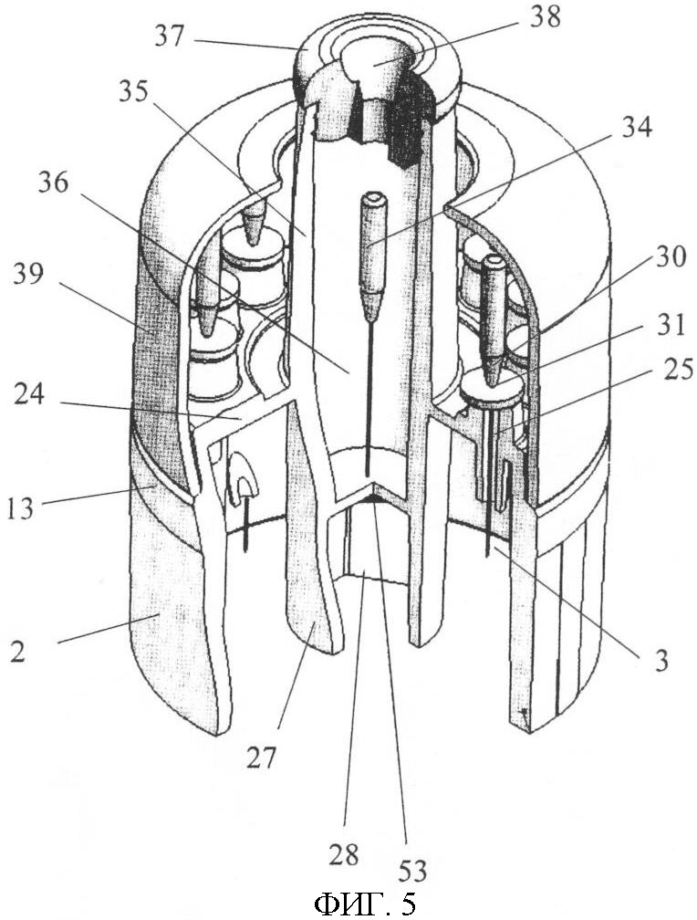 Чтобы далее подробно описать данный узел отметим, что каждый инструмент 3 включает рабочую часть для работы в разных частях корневого канала (коронковой, средней, апикальной) и расширенную головную часть 30 для закрепления в ондодонтическом моторе или для закрепления в рукоятке, например, силиконовой для большего удобства использования (ручной инструмент). В фиксированной позиции на средстве временного закрепления инструментов каждый инструмент 3 опирается расширенной головной частью 30 на кромку 31 соответствующего сквозного отверстия 25 и тянется рабочей частью в пространство внутри отверстия 25 (фиг.5). Как было указано выше, муфта временного соединения привода со средством временного закрепления инструментов содержит шестигранной формы выходной вал 18 шагового двигателя и коаксиальный выступ 27 с шестигранной выемкой 28 средства временного закрепления инструментов.