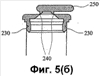 На фиг.5 показаны как перспективное изображение а), так и разрез б) колпачка 180 для порта 30, изображенного на фиг.1-4. Выступы 200, входящие в зацепление с соответствующими канавками 190, тем самым ориентируя колпачок 180 и предотвращая перекручивание, также изображены. Особенно хорошо можно распознать на чертеже в разрезе (фиг.5б) элементы 230, которые входят в зацепление с фиксирующими деталями 220, фиг.3 и 4. Такой колпачок 180 может изготавливаться из полипропилена методом литья под давлением. Колпачок 180 выполняется с заданной точкой излома 240, в которой может обламываться ручка с дужкой 250. Если есть плоское уплотнение в колпачке, то после отламывания ручки с дужкой 250 уплотнительную прокладку можно проколоть иглой.