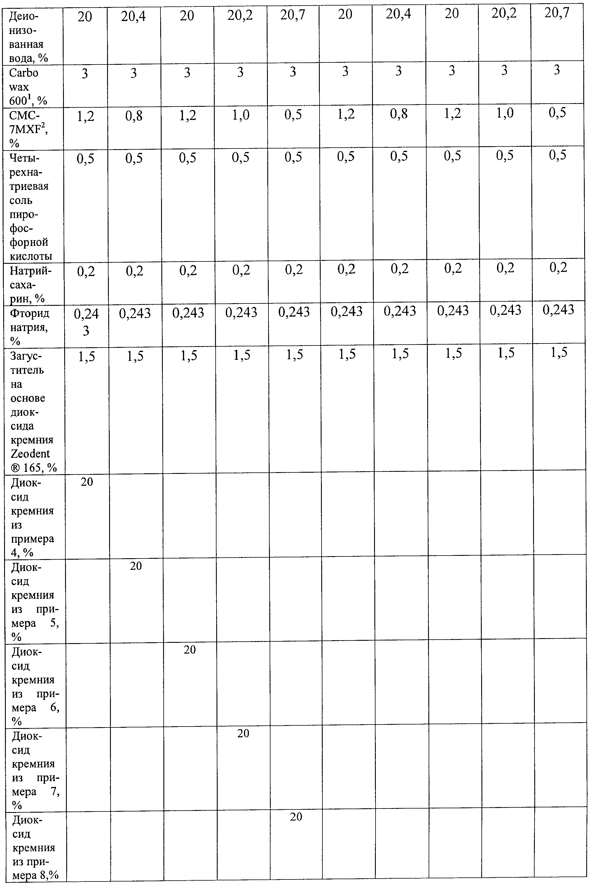 Для того чтобы в целях улучшения контроля дополнить и модифицировать реологические свойства, такие как нарастание вязкости, устойчивость, отекание с зубной щетки и тому подобное, в качестве загущающих компонентов для средств по уходу за зубами и других подобных пастообразных материалов использовали также и синтетические разновидности диоксида кремния (более высокой структуры). Например, в случае рецептур зубной пасты существует потребность в предложении стабильной пасты, которая может удовлетворить несколько потребительских требований, включающих нижеследующее и не ограничивающихся только этим: способность доставляться из контейнера (такого как тюбик) в результате приложения давления (то есть выдавливания из тюбика) в виде пасты со стабильными размерами и возвращаться к своему прежнему состоянию после прекращения действия такого давления, способность таким образом доставляться на головную часть зубной щетки легко и без вытекания из тюбика во время и после такой доставки, предрасположенность к сохранению стабильности размеров на зубной щетке до использования и при нанесении на целевые зубы до проведения чистки зубной щеткой и демонстрация надлежащего вкусового впечатления в эстетических целях, по меньшей мере, во благо пользователя.