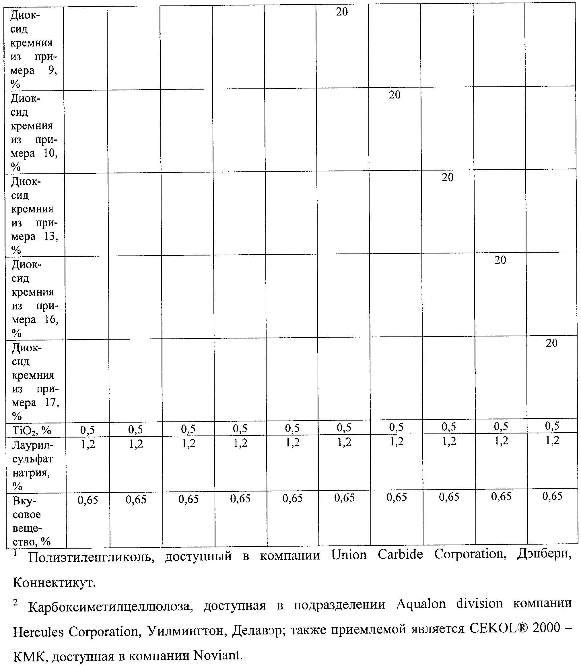 Описанная выше смесь осажденного и гелеобразного диоксида кремния в случае ввода ее в композиции средств по уходу за зубами присутствует в них при уровне содержания в диапазоне от приблизительно 5% до приблизительно 50 мас.%, более предпочтительно от приблизительно 10% до приблизительно 35 мас.%, в особенности тогда, когда средство по уходу за зубами представляет собой зубную пасту. Средства по уходу за зубами или для очищения ротовой полости, включающие абразивные композиции данного изобретения, в удобном случае могут содержать следующие далее возможные ингредиенты и их относительные количества (все количества в мас.%):