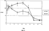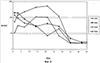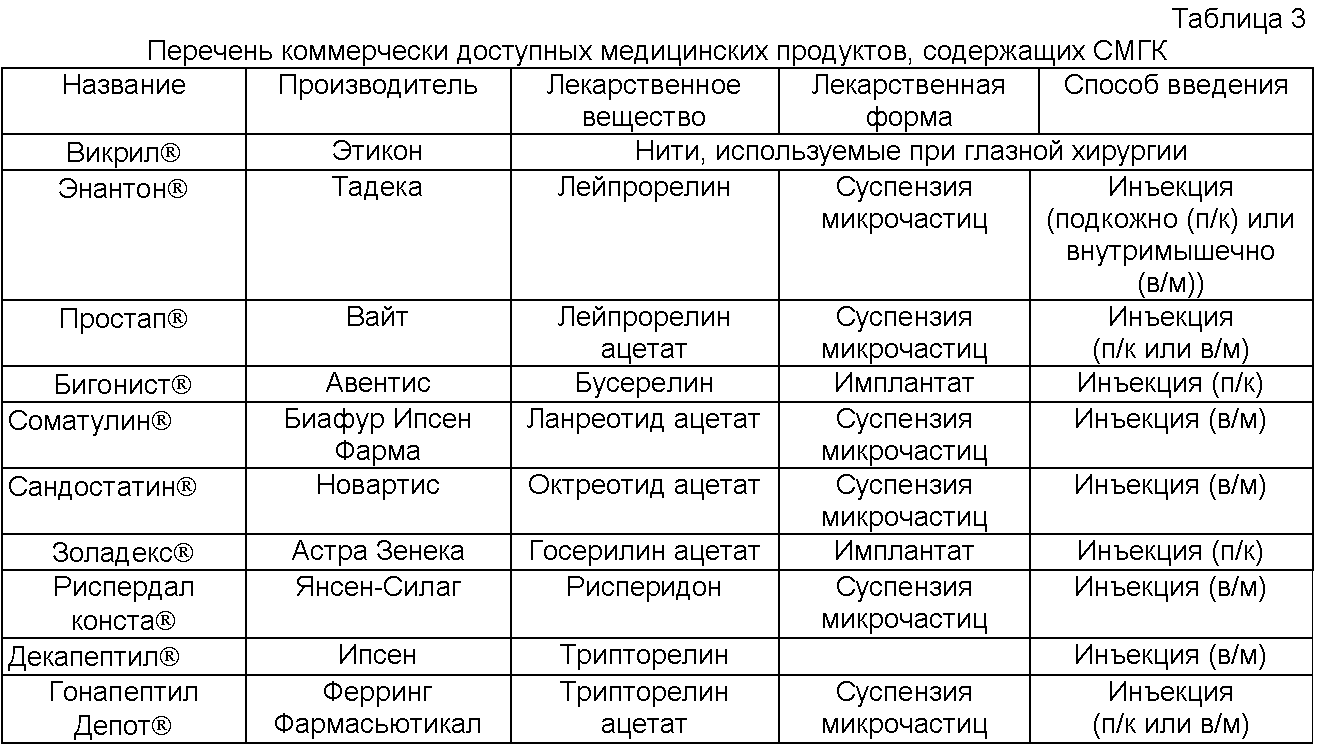 Известно, что составы СМГК биодеградируемых полимеров, содержащих активный агент, обычно характеризуются сигмоидальной кривой высвобождения (которая изображается как зависимость процента высвобожденного активного агента от времени), то есть после относительно долгого начального периода задержки (первая фаза высвобождения), когда высвобождается совсем небольшое количество активного агента, далее следует значительный подъем кривой, когда высвобождается наибольшее количество активного агента (вторая фаза высвобождения), затем следует почти горизонтальный участок кривой (третья фаза высвобождения), когда высвобождение лекарства достигает плато.