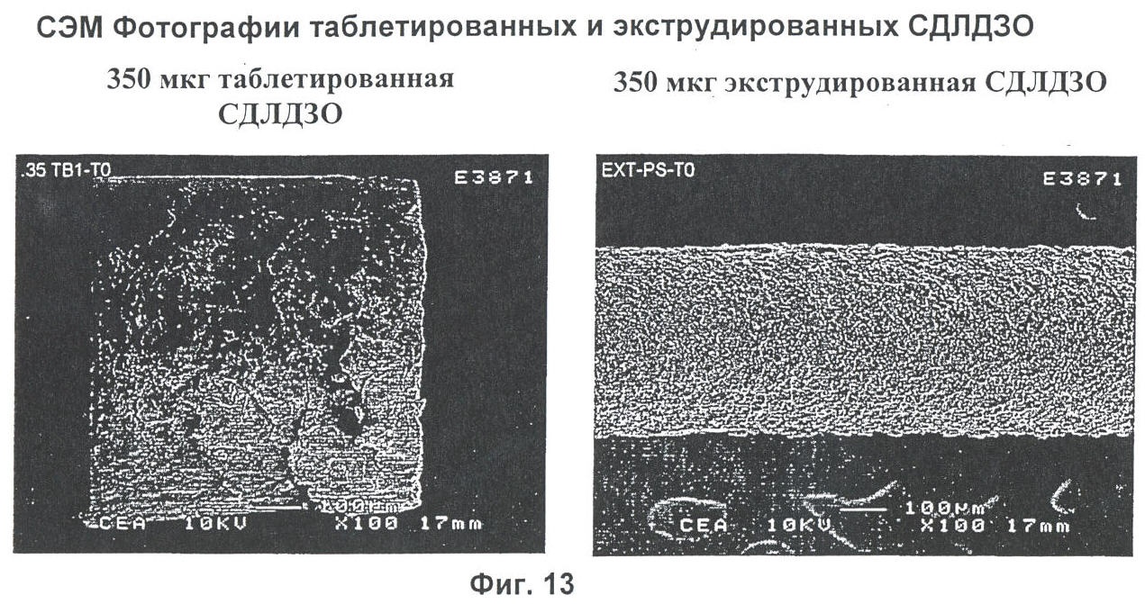 Фиг.13 представляет собой фотографии сканирующей электронной микроскопии СДЛДЗО имплантатов, изготовленных способом таблетирования и способом однократной экструзией.