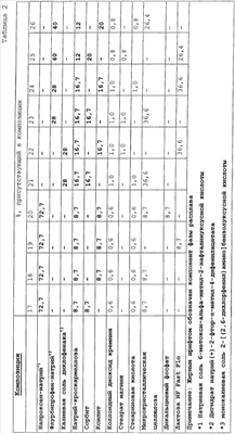 Доля соли НПВЛС в фармацевтической композиции будет зависеть от дозы, желательной для получения терапевтического эффекта. Лекарственные средства, применяемые в низких дозах, такие как соли флурбипрофена и кетопрофена, могут составлять всего 20 мас.% (например, от 20 до 70%) от массы гранулированного компонента фармацевтической композиции, чтобы фармацевтическая дозированная форма (т.е. таблетка), изготовленная из композиции, не была слишком маленькой. Однако предпочтительным признаком изобретения является то, что из солей НПВЛС, применяемых в высоких дозах, таких как соли ибупрофена, можно изготавливать дозированные формы меньших размеров. Соответственно, соль НПВЛС обычно составляет количество, превышающее или равное 60 мас.%, предпочтительно, превышающее или равное 65 мас.%, более предпочтительно, превышающее или равное 70 мас.%, от массы гранулированного компонента фармацевтической композиции. Соответственно соль НПВЛС обычно составляет количество, менее или равное 99 мас.%, предпочтительно, менее или равное 95 мас.%, более предпочтительно, менее или равное 90 мас.%, наиболее предпочтительно, менее или равное 85 мас.%, от массы гранулированного компонента фармацевтической композиции.