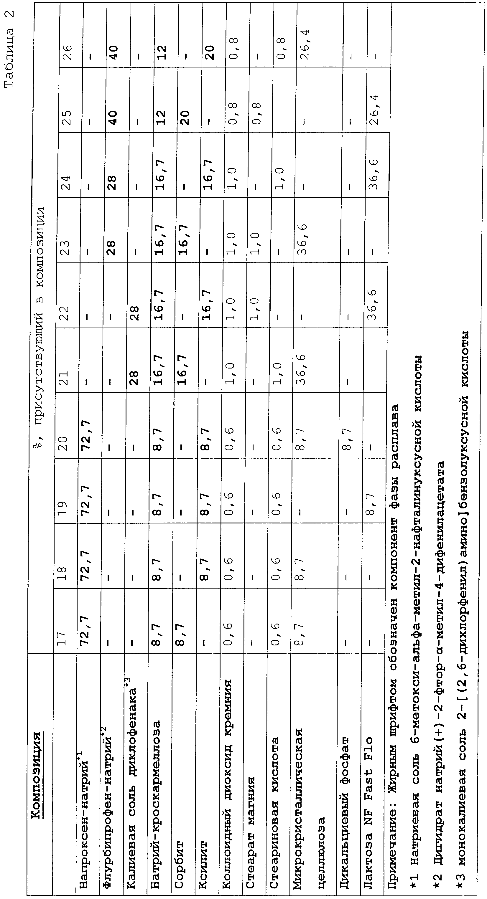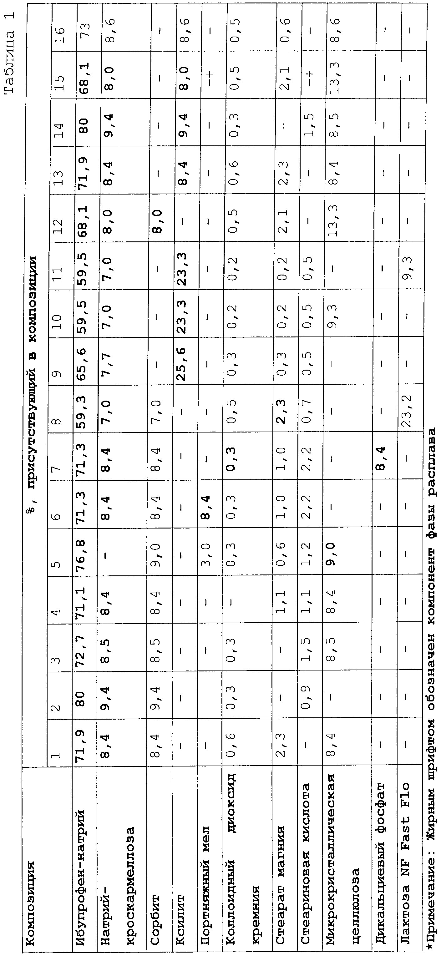 Согласно предпочтительной особенности настоящее изобретение относится к фармацевтической композиции, содержащей гранулированный компонент, включающий множество отвержденных полученных из расплава гранул сахарного спирта и содержащиеся в нем инкорпорированные соль НПВЛС и разрыхлитель. Предпочтительно, фармацевтическая композиция содержит гранулированный компонент, включающий множество полученных из расплава гранул расплавленного сахарного спирта с однородно диспергированными в нем инкорпорированными солью НПВЛС и разрыхлителем. Предпочтительно, натрий-кроскармеллоза или гликолят натрий-крахмала (хотя можно использовать любой известный разрыхлитель) может быть единственным эксципиентом, инкорпорированным в гранулированный компонент. Альтернативно, гранулированный компонент может содержать дополнительные эксципиенты, такие как разбавитель и, необязательно, поверхностно-активный агент. Соответственно, гранулированный компонент может состоять, преимущественно (т.е. более чем 95 мас.% от массы гранулированного компонента), из сахарного спирта, соли НПВЛС и разрыхлителя, или он может состоять, преимущественно, из сахарного спирта, соли НПВЛС, разрыхлителя, разбавителя и, необязательно, поверхностно-активного агента. Таким образом, разбавитель и необязательный поверхностно-активный агент могут быть объединены с разрыхлителем, солью НПВЛС и расплавленным сахарным спиртом.