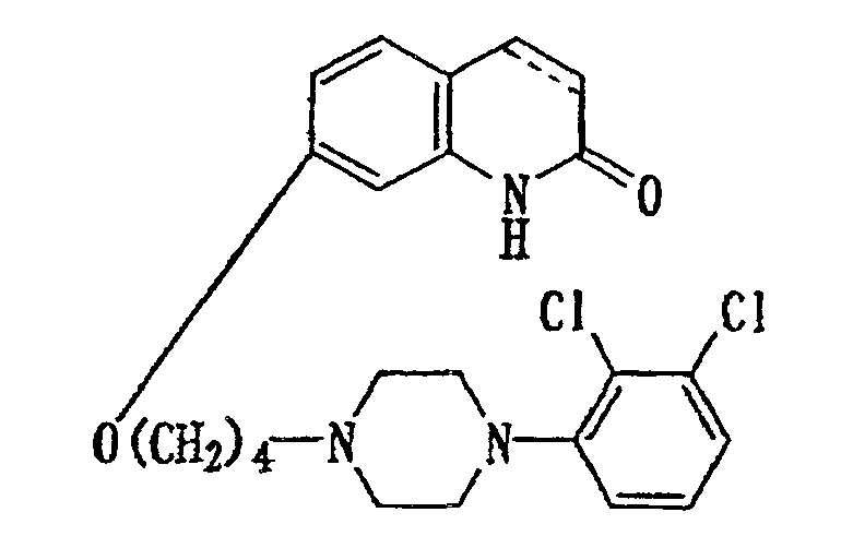 Арипипразол, называемый также 7-{4-[4-(2,3-дихлорфенил)-1-пиперазинил]бутокси}-3,4-дигидро-2(1H)-хинолиноном, является соединением карбостирила, и его можно использовать для лечения шизофрении (EP 0 367 141, патент США No. 5,006,528). Арипипразол известен также как 7-{4-[4-(2,3-дихлорфенил)-1-пиперазинил]бутокси}-3,4-дигидрокарбостирил, Abilify, OPC-14597, OPC-31 и BMS-337039. Арипипразол обладает агонистической активностью в отношении 5-HT1A рецептора и известен как соединение, которое можно использовать для лечения таких типов депрессий и стойких депрессий, как эндогенная депрессия, большая депрессия, меланхолия и пр. (WO 02/060423, Патентная заявка США 2002/0173513A1). Арипипразол обладает активностью в качестве агониста рецепторов серотонина и рецепторов допамина и действует как агонист или частичный агонист рецептора серотонина 5-HT1A и как агонист или частичный агонист рецептора допамина D2. Арипипразол является стабилизатором системы допамин-серотонин. Метаболиты арипипразола включены в объем настоящего изобретения. Один такой метаболит арипипразола носит название дегидроарипипразол. Другие такие метаболиты арипипразола, включенные в настоящее изобретение, представлены на фиг.8. Предпочтительные метаболиты, представленные на фиг.8, имеют следующие обозначения: OPC-14857, DM-1458, DM-1451, DM-1452, DM-1454 и DCPP.