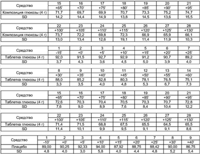 На второй день 12 субъектам давали две изготавливаемых в промышленности таблетки глюкозы (таблетки глюкозы с ароматом апельсина, Dex 4, изготовленные AMG Medical Inc., Montreal, Quebec), каждая из которых содержала 4 г глюкозы. Субъекты таблетки жевали и проглатывали. Уровни глюкозы в крови (мг/дкл) субъектов измеряли с интервалами от момента времени = -10 минутам.