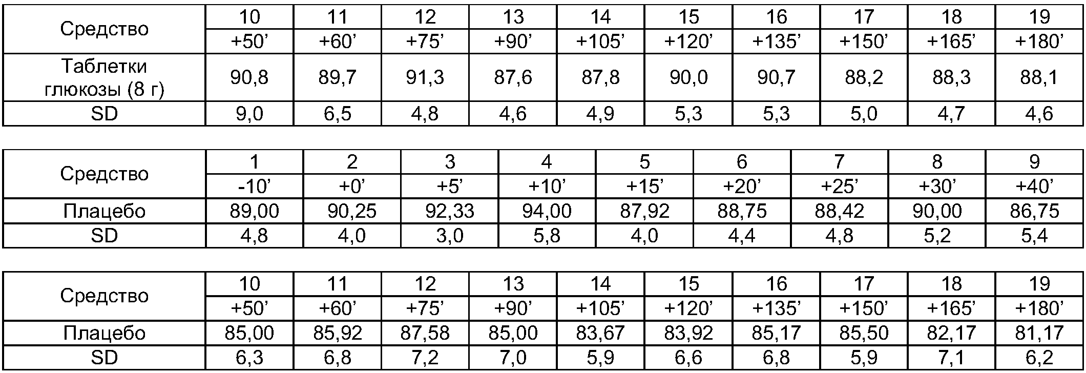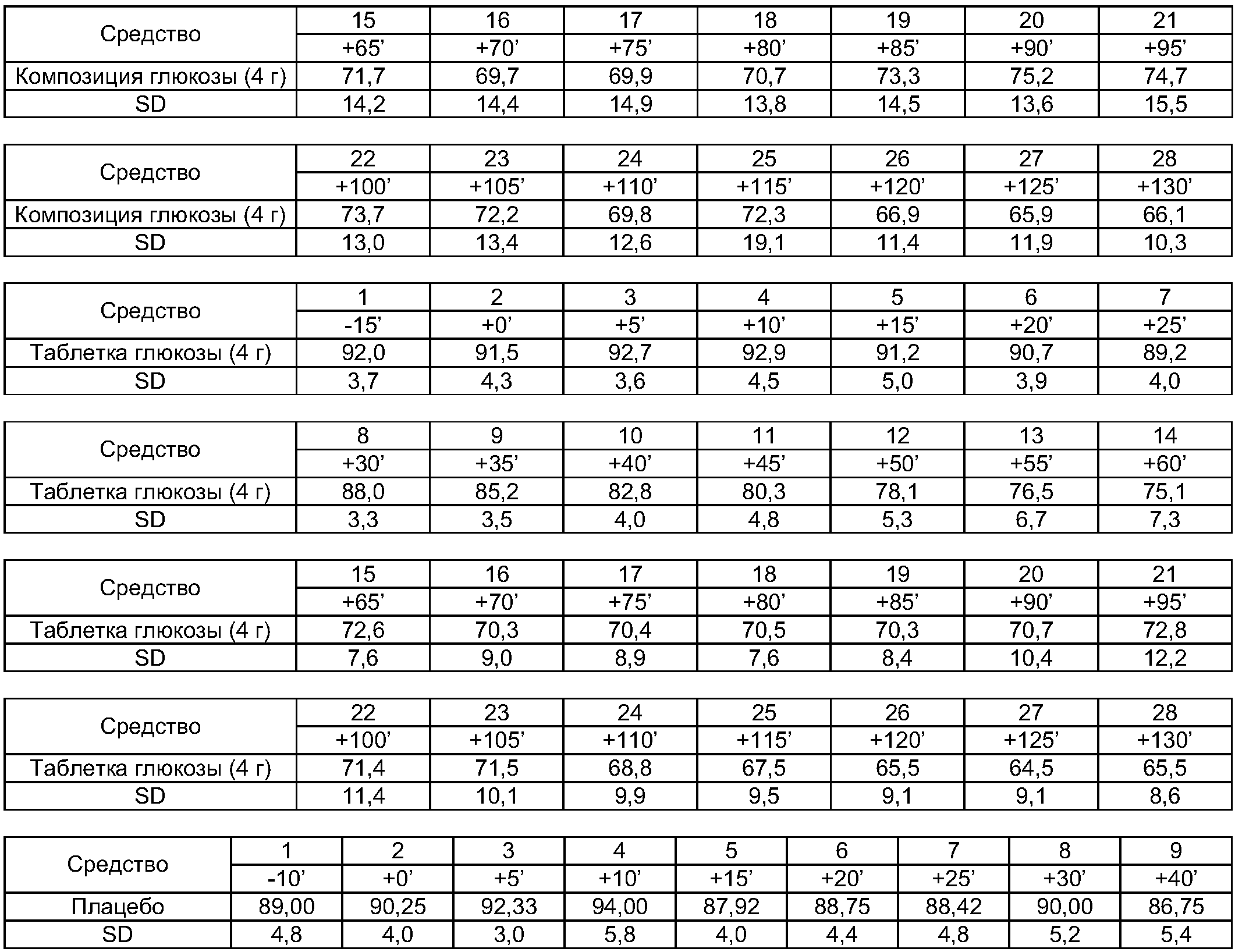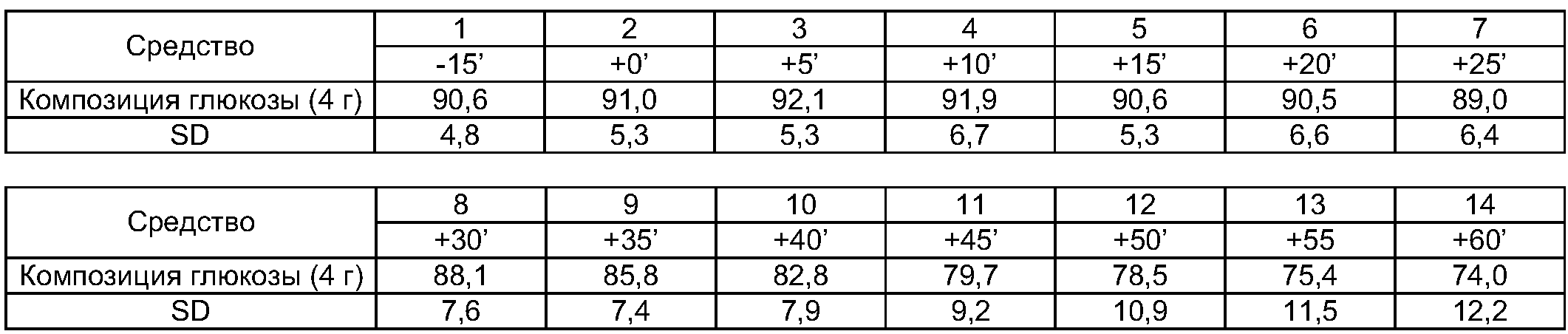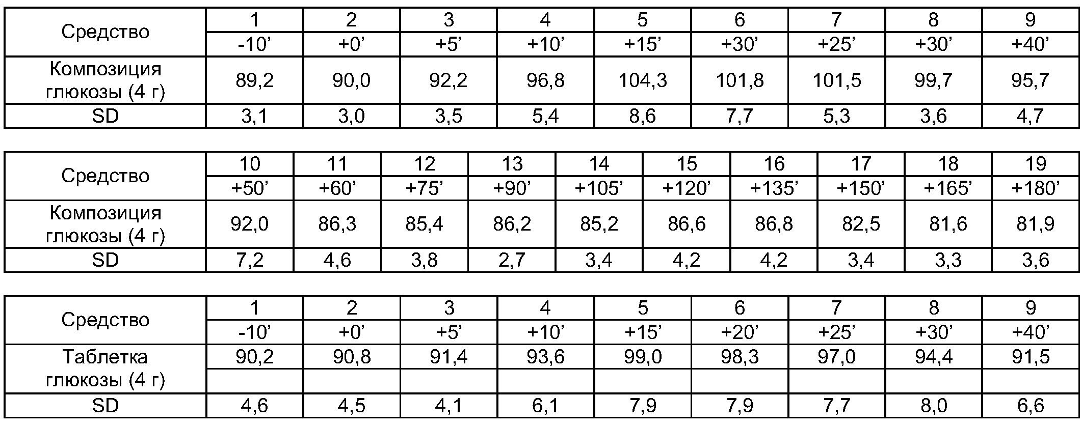 11 субъектам вводили 0,11 МЕ/кг массы тела инсулина подкожной инъекцией в момент времени = 0 минут. В момент времени, равный 70 минутам, субъектам давали выпускаемую промышленностью таблетку глюкозы (таблетки глюкозы с ароматом апельсина Dex 4, изготовленные AMG Medical Inc., Montreal, Quebec), содержащую 4 г глюкозы. Субъекты таблетку жевали и глотали. Уровни глюкозы в крови (мг/дкл) субъектов измеряли с интервалами от момента времени = -15 минут.