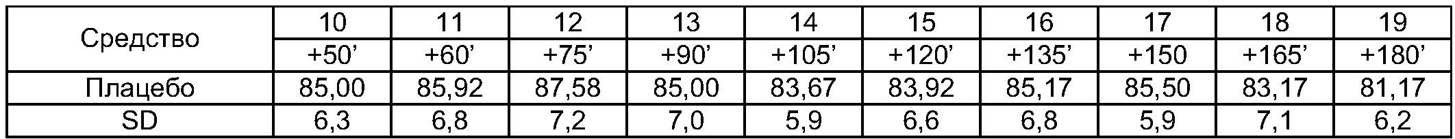 На второй день тем же самым 11 субъектам вводили 0,11 МЕ/кг массы тела инсулина в момент времени = 0 минутам. В момент времени, равный 70 минутам, субъектам давали композицию глюкозы, описанную выше по тексту, согласно настоящему изобретению. Композицию глюкозы распыляли в полости рта с применением стандартного неаэрозольного дозирующего устройства, снабженного трубкой, погруженной в жидкость, глюкоза абсорбировалась через мембраны рта, и остаточная жидкость проглатывалась. Количество композиции глюкозы, введенной и проглатываемой было эквивалентно 4 г глюкозы. Уровни глюкозы (мг/дкл) у субъектов измеряли с интервалами от момента времени = -15 минут.