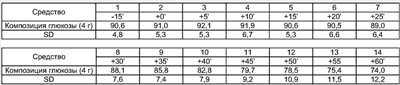 12 субъектам давали описанную выше по тексту композицию глюкозы, согласно настоящему изобретению. Композицию глюкозы распыляли в полости рта с применением стандартного неаэрозольного дозирующего устройства, снабженного трубкой, опущенной в жидкость, глюкоза абсорбировалась через мембраны рта, и остаточная жидкость проглатывалась. Количество композиции глюкозы, введенной и проглатываемой, эквивалентно 8 г глюкозы. Уровни глюкозы в крови (мг/дкл) измеряли с интервалами от момента времени = -10 минутам.