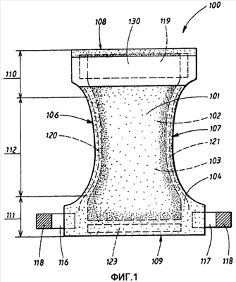 Подгузник 100 имеет, по существу, форму песочных часов с боковыми краями 106, 107, которые вытягиваются в продольном направлении, передним краем 108, который вытягивается в поперечном направлении, и задним краем 109, который вытягивается в поперечном направлении, и имеет переднюю часть талии 110, заднюю часть талии 111 и ластовичную часть 112, которая располагается между передней и задней частями талии. Передняя часть талии 110 является частью подгузника 110, которая предназначена для обращения по направлению вперед на пользователе во время применения подгузника, и задняя часть талии 111 является частью подгузника 110, которая обращается по направлению назад от пользователя. Ластовичная часть 112 является частью подгузника, которая при применении располагается в ластовице пользователя и, как ожидается, принимает и адсорбирует физиологические секреции, которые передаются подгузнику 100. Ластовичная часть занимает приблизительно 50% длины подгузника и может слегка смещаться вперед и назад в подгузнике.