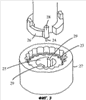 На фиг.3 представлен другой радиальный вариант реализации настоящего изобретения. В этом варианте реализации перемещение собачки 26 управляется канавкой 23 в гайке 27. Канавка 23 зацепляется элементом 24, ведомым канавкой/кулачком, которая точно направляет шпонку 28 уменьшения дозы от зубца к соседнему зубцу при установке дозы. В отличие от фиг.2, отверстие 25 в центре гайки 27 снабжено элементом 29, ведомым канавкой. Этот элемент, ведомый канавкой, выполнен с возможностью сцепления с канавкой на наружной поверхности поршневого штока (не показан).