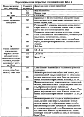 Диагноз: Старческая атрофия кожи лица умеренной степени: К2, МЗ, Ж2, П2 (табл.2).