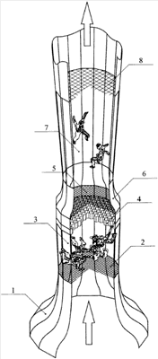 Аэродинамическая труба работает следующим образом. Вентиляторная установка (на чертеже не показана), создает перепад давления, под действием которого воздух в контуре трубы движется снизу вверх. Во входном конфузоре 1 происходит ускорение воздуха и выравнивание поля скоростей. В первой рабочей зоне 3 происходит подготовка парашютистов, которые занимаются групповой акробатикой, или первоначальной подготовкой. При этом нарушается равномерность поля скоростей потока, тела парашютистов создают спутный след, а их перемещения приводят к скосам и закручиванию потока. В хонейкомбе 4 происходит уменьшение масштаба турбулентности, закручивания и скоса потока. На промежуточной предохранительной сетке 5 происходит частичное выравнивание поля скоростей. В промежуточном конфузоре 6 также происходит ускорение и частичное выравнивание поля скоростей. Кроме того, на отрезке между рабочими сечениями первой и второй рабочих зон происходит естественное выравнивание поля скоростей за счет вязкости воздуха и турбулентного обмена. Во второй рабочей зоне 7 происходит подготовка парашютистов, которые занимаются артистическими видами парашютного спорта. Кроме того, поскольку вторая рабочая зона является диффузором, в ней происходит торможение потока и частичное восстановление полного давления, после чего воздух либо выбрасывается в атмосферу (в случае, если аэродинамическая труба имеет открытый контур), либо поступает в обратный канал и возвращается во входной конфузор 1 (в случае, если аэродинамическая труба имеет замкнутый контур). В случае внезапного отключения привода парашютисты, которые работают в первой рабочей зоне, опускаются на входную предохранительную сетку, а парашютисты, которые работают во второй рабочей зоне, на промежуточную предохранительную сетку.
