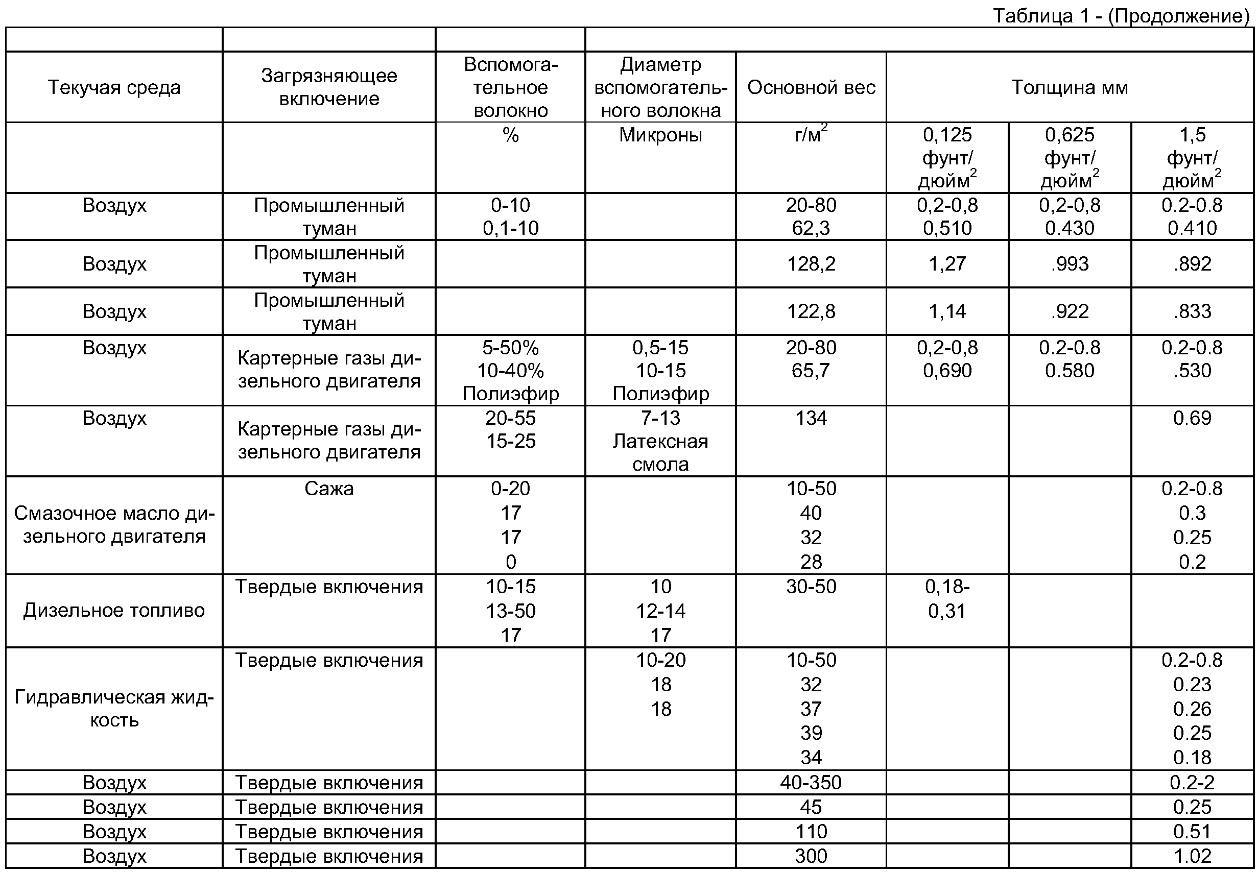 Результаты показывают, что связующие волокна Teijin TJ04CN, Unitika 3380 и Unitika 3300 повышают прочность внутреннего склеивания в синтетическом материале, и волокна Unitika 3300 обеспечивают получение наилучшего результата. Листы без добавления волокон Unitika 3300 имели наихудшую прочность внутреннего склеивания. Прочность соединений в листах была оптимальной при добавлении в смесь 15-20% волокон Unitika 3300. Прочность внутреннего склеивания в прессованных листах была выше, чем в листах, изготовленных без прессования. Латексная смола не обеспечивает достаточной прочности внутреннего склеивания для полиэфирных волокон. Латексная смола может использоваться вместе со связующими волокнами, но они могут дать большее увеличение прочности внутреннего склеивания без латексной смолы. Для изготовления листовых материалов в соответствии с изобретением обычно используются процессы, используемые для изготовления бумаги. Такие “мокрые” процессы являются особенно подходящими для целей изобретения, и многие из волокон-компонентов предназначены для обработки их водных дисперсионных систем. Однако предлагаемый в изобретении материал может быть получен с использованием “сухих” процессов, в которых используются те же самые компоненты, предназначенные для основной обработки. Для “мокрого” изготовления листов может использоваться следующее оборудование: устройства для ручного изготовления листов, длинносеточные бумагоделательные машины, цилиндрические бумагоделательные машины, наклонные бумагоделательные машины, различные комбинации бумагоделательных и других машин, которые могут обеспечить соответствующее перемешивание бумаги, формирование слоя или слоев компонентов смеси и удаление текучих компонентов для формирования влажного листа. Смесь волокон (суспензия), содержащая составляющие материалы, обычно перемешивается для формирования достаточно однородной суспензии. Затем суспензия, содержащая волокна, подвергается “мокрым” процессам изготовления бумаги. После формирования из суспензии влажного листа он высушивается, отверждается и проходит любую другую обработку для формирования сухого проницаемого листа, материала или фильтра. После соответствующего высушивания и формирования фильтрующего материала листы обычно имеют толщину от примерно 0,25 мм до примерно 1,9 мм, и основной вес от примерно 20 г/м2 до примерно 200 г/м2 или от примерно 30 г/м2 до примерно 150 г/м2. Для производства на промышленной основе предлагаемые в изобретении двухкомпонентные пластины обычно обрабатываются с использованием машин, аналогичных бумагоделательным машинам, таким как имеющиеся на рынке проволочные цилиндры Fourdrinier, машины Stevens Former, Roto Former, Inver Former, Venti Former и наклонные машины Delta Former. Предпочтительно используется наклонная машина Delta Former. Предлагаемые в изобретении двухкомпонентные пластины могут быть изготовлены, например, путем формирования суспензий, содержащих пульпу и стеклянные волокна, и смешиванием этих суспензий в чанах-смесителях. Количество воды, используемой в процессе, может изменяться в зависимости от используемого оборудования. Смесь может быть направлена в обычный напорный бак, где она обезвоживается и оседает на движущемся проволочном сите, после чего осуществляется ее дополнительное обезвоживание с использованием вакуума для формиров
