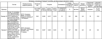 Процедура ручного изготовления листа материала включает начальное развешивание указанных волокон. Примерно шесть капель Emerhurst 2348 добавлялось в 100 мл воды, и раствор отставлялся для последующего использования. В контейнер объемом 5 галлонов наливали 2 галлона чистой водопроводной воды, добавляли 3 мл раствора Emerhurst и перемешивали. Затем добавляли синтетические волокна и перемешивали не менее 5 минут перед тем, как добавить вспомогательные волокна. Мешалку Waring заполняли водой от 1/2 до 3/4 объема и добавляли 3 мл 70% серной кислоты. Затем добавляли стекловолокно. Осуществляли перемешивание в течение 30 секунд на самой низкой скорости. Добавляли синтетические волокна в ведро. Перемешивали еще 5 минут. Добавляли в контейнер связующие волокна. Используемый промежуточный чан предварительно чистили и промывали. Вставляли сито для листа и заполняли до первого ограничителя. Удаляли воздух, попавший под сито, с помощью плунжера. Помещали смесь в промежуточный чан, перемешивали плунжером и осуществляли дренаж. Осуществляли отсос листа с помощью щелевой вакуумной насадки. Если прессование не требовалось, то извлекали лист из сита и высушивали при температуре 250°F. Листы, прессованные под давлением 100 psi Ниже приведены характеристики прессованных листов, которые были изготовлены с 1.09.2005 г. по 14.09.2005 с использованием указанных выше составов смесей. Листы прессовались под давлением 100 psi.