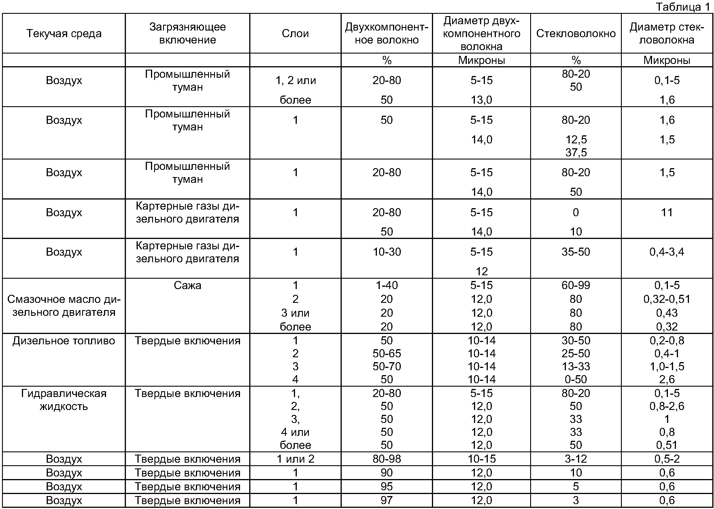 Настоящая заявка подана как международная заявка РСТ 04.11.2005 г. на имя компании Donaldson Company, Inc., США, которая является заявителем для всех указанных стран, кроме США, и на имя Keh В. Dema, Joe Israel, Derek O. Jones, Brad E. Kahlbaugh, Gregory LaVallee, Michael A. Madden, Linda M. Olson, Robert M. Rogers и Paul L. Kojetin, все граждане США, и Chuanfang Yang, гражданин Китая, которые являются заявителями только для США, и в настоящей заявке испрашивается приоритет патентных заявок США: ОБЛАСТЬ ТЕХНИКИ Изобретение относится к сформированным слоям, фильтрующим материалам и фильтрам, обладающим прочностью, сжимаемостью и высокой производительностью для удаления частиц из потока текучей среды (воздух, газ или жидкость). Фильтр и фильтрующий материал содержат нетканое полотно, изготовленное для получения таких фильтрационных характеристик (проницаемость, эффективность, интенсивность задерживания загрязнений и др.), что оно становится пригодным для удаления частиц из маловязких жидкостей и газов. Изобретение относится к слоям нетканого материала, обладающим достаточной прочностью на разрыв при растяжении, в том числе в мокром состоянии, прочность на разрыв при продавливании и другими характеристиками, обеспечивающими безотказное функционирование при обычных условиях фильтрации, таких как изменения интенсивности потока, температуры, давления и концентрации частиц в процессе удаления частиц из потока текучей среды. Кроме того, изобретение относится к конструкциям фильтров, содержащим один или несколько слоев материала, обеспечивающего удаление частиц вместе с другими слоями аналогичных или отличающихся материалов. Эти слои могут размещаться на пористом или перфорированном несущем элементе, который обеспечивает механическую прочность в процессе фильтрации. Такие конструкции могут быть реализованы в любых формах фильтров, таких как панели, картриджи, фильтрующие вставки и др. Настоящее изобретение относится к слоям фильтрующих материалов и к способам фильтрации газов и водных или неводных жидкостей. Газовые потоки могут включать как воздух, так и отходящие газы производственных процессов. Жидкости могут включать воду, топлива, масла, гидравлические жидкости и т.п. Настоящее изобретение также относится к системам и способам отделения частиц, захваченных газом или жидкостью. Изобретение также относится к гидрофобным текучим средам (таким как масла или водные эмульсии масел или другие смеси масел), присутствующим в форме аэрозолей в газовых потоках (например, аэрозоли в картерных газах двигателя). Предпочтительные варианты конструкций также обеспечивают выделение других тонкодисперсных загрязняющих включений, например углеродных материалов из воздушных потоков. Также предлагаются способы осуществления фильтрации. ПРЕДПОСЫЛКИ ДЛЯ СОЗДАНИЯ ИЗОБРЕТЕНИЯ Нетканые полотна для многих приложений, в том числе и для фильтрующих материалов, производятся уже в течение многих лет. Такие структуры, которые могут быть изготовлены из двухкомпонентных материалов или материалов “сердечник-оболочка”, описаны, например, в следующих патентах США: Делались неоднократные попытки создания конструкций с использованием нетканого полотна и подходящих перфорированных несущих элементов. Частыми недостатками многих конструкций, изготовленных из нетканых материалов, получаемых из расплава аэродинамич
