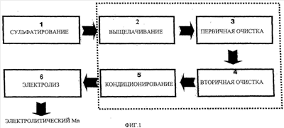 На фиг.1 показана блок-схема процесса, который начинается с фазы (1) сульфатирования, за которой следует гидрометаллургическая фаза, состоящая из четырех стадий: выщелачивание (2), первичная очистка (3), вторичная очистка (4) и кондиционирование (6), чтобы наконец достигнуть фазы (6) электролиза для получения электролитического марганца.