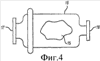 фиг.4 показывает прокаленный элемент фильтра на фиг.3, установленный в оболочке из листового металла, имеющей вход и выход, так что выхлопной газ из дизельного двигателя, направляемый на вход оболочки, проходит через элемент фильтра, а затем выходит из выхода оболочки; и