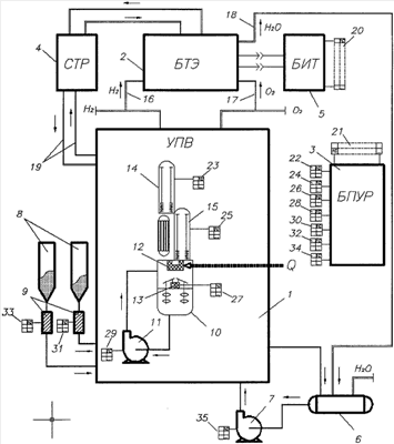В результате работы установки получения водорода 1 вырабатывается водород Н2 и кислород О2, которые накапливаются в соответствующих емкостях (не показаны). Необходимое количество этих газов по трубопроводам 16, 17 подается в батарею топливных элементов 2, в которой в результате химической реакции окисления водорода кислородом происходит прямое преобразование химической энергии топлива в электрическую – вырабатывается постоянный электрический ток. Он преобразуется в блоке инвертирования и трансформации 5 до необходимого напряжения и частоты и через разъемы 20-21 подается в блок питания, управления и регулирования 3. Этот блок осуществляет электропитание вибраторов реактора восстановления 14, 15 через разъемы 22-23 и 24-25 перемешивающего устройства 13 реактора окисления 10 через разъемы 26-27, насоса 11 через разъем 28-29, шнеков твердых компонентов через разъемы 30-31 и 32-33, водяного насоса 7 через разъем 34-35 и других потребителей электроэнергии. Часть электроэнергии используется также для осуществления управления и регулирования установки. Вода, образующаяся в батарее топливных элементов 2, по трубопроводу 18 подается в резервуар 6. Система терморегулирования 4 батареи топливных элементов, подавая теплоноситель по трубопроводам 19, осуществляет регенерацию тепла в тепловых устройствах установки получения водорода, что особенно эффективно при использовании среднетемпературных и высокотемпературных топливных элементов и повышает КПД системы в целом.