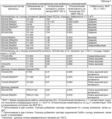Эксперименты с промышленными катализаторами демонстрируют хорошее влияние на стабильность катализатора, содержащего только 10 мас.% Ni относительно Со. Дополнительные испытания катализатора с соотношением Ni/Co=50/50 ат.% показали неблагоприятное влияние Ni в связи со снижением селективности по углеводородам С5+. Этого следовало ожидать, так как при таких высоких концентрациях никеля свойства катализатора синтеза Фишера-Тропша теперь определяются активностью никеля.