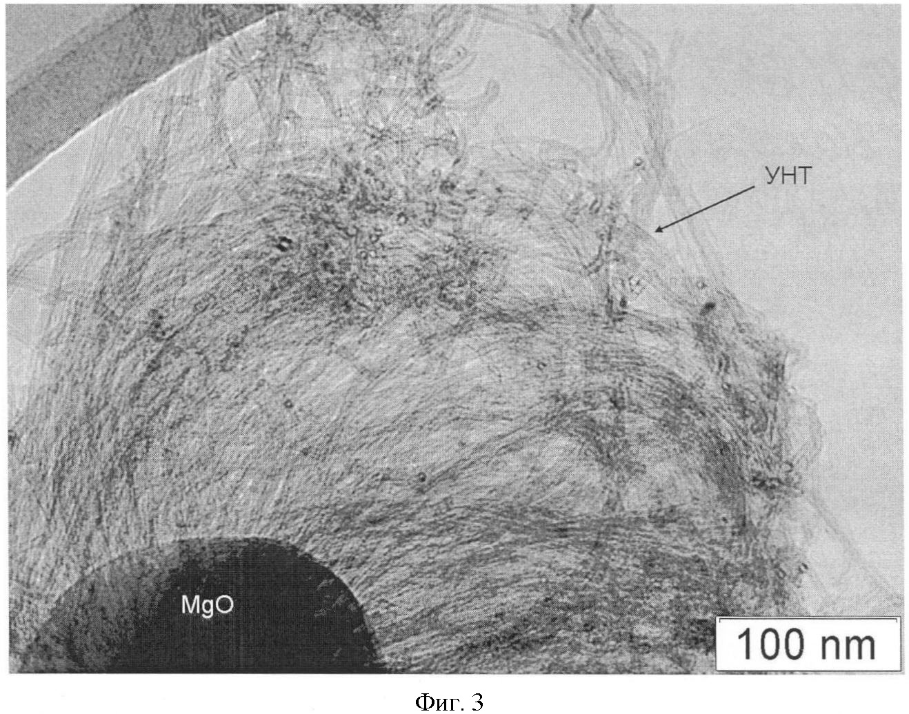 получаемого способом, аналогичным примеру 1, помещают в трубчатую печь, нагреваемую управляемой печью. Затем проводят восстановление катализатора в течение 10 мин. Через реактор пускают ток водорода со скоростью 50 мл/мин. Реактор нагревают до 900°С. Затем подается источник углерода (метан) со скоростью 300 мл/мин. Синтез проводят в течение 60 мин. В результате синтеза образуется черное рыхлое вещество (УНТ), масса углеродного вещества составила 240 мг.