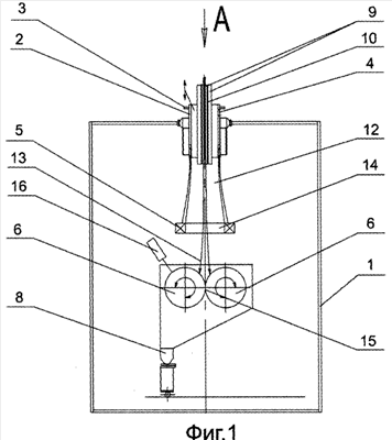 Устройство состоит из вакуумной камеры 1 с размещенными в ней полым катодом 2, закрепленным на катододержателе 3 с помощью механизма крепления катода к катододержателю 4, анодом 5, группой охлаждаемых мишеней 6, узлом слежения за зазором между мишенями 7 и приемной емкостью 8. Катод 2 снабжен каналом для подачи плазмообразующего газа 9 и водоохлаждаемой трубкой для подачи исходного порошка 10. Каждая из мишеней 6 оснащена механизмом перемещения и управления скоростью и направлением вращения 11.