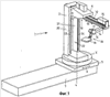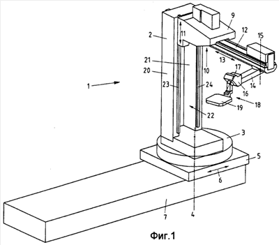 Вертикальная главная балка 2 снабжена двумя боковыми несущими профилями 20, 21, которые ограничивают между собой центральную выемку 22. Горизонтальная стрела 12 может входить в эту выемку 22, так что ее за счет этой выемки 22 можно задним концом сдвигать назад. За счет этого обеспечивается большой путь сдвига горизонтальной стрелы 12. На торцевой стороне каждого несущего профиля 20, 21 закреплена направляющая планка 23, 24, которые служат совместно для направления вертикальной каретки 9. По меньшей мере, одна из обеих направляющих планок 23, 24 предпочтительно выполнена в виде зубчатой рейки для того, чтобы расположенное на вертикальной каретке 9, приводимое электродвигателем зубчатое колесо (не изображено) могло входить с ней в зацепление с геометрическим замыканием для обеспечения перемещения вертикальной каретки 9 вверх или вниз. Вертикальная каретка 9 предпочтительно опирается также с помощью линейной направляющей на главную балку 2. Для этого обе направляющие планки или, соответственно, зубчатые рейки 23, 24 могут быть снабжены направляющей в виде ласточкина хвоста. В качестве альтернативного решения к зубчатому приводу может быть предусмотрен, например, также шпиндельный привод, в частности с шариковым винтом, для вертикальной каретки 9. В любом случае оба варианта привода обеспечивают воспроизводимо точное достижение заданного вертикального положения.