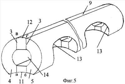 Бревно 1 со своей нижней стороны выполнено с продольным пазом 2 дугообразной в сечении формы по всей длине бревна 1 – пазом сопряжения верхнего в венце бревна по отношению к нижнему. В бревне 1 намечена горизонтальная плоскость 3, по которой будет произведена распиловка бревна вдоль осевой центральной линии на две части. После проведения указанной распиловки образованы две части 4 и 5 бревна, вдоль оси которых со стороны плоскости 3 распиловки выполнены V-образные в сечении пазы 7 и 8 соответственно на всю длину бревна 1. На фиг.2 части 4 и 5 показаны раздвинутыми. До выполнения пазов 7 и 8 из центральной части бревна 1 большого диаметра, большего, чем нужно для сборки бревенчатой стены, выпилена продольная доска 9. Позицией 9 обозначены и боковины, которые вставлены между раздвинутыми распиленными частями, как показано на фиг.5. Конструкция сборного бревна выполнена путем жесткого соединения по плоской поверхности 3 распиловки отдельных частей бревна 4 и 5 с образованием продольными пазами 7 и 8 продольной внутренней полости 10 осевой ориентации (фиг.4). На фиг.4 при выполнении пазов 7 и 8 в сечении V-образной формы продольная внутренняя полость 10 бревна имеет в сечении ромбовидную форму. Форма поперечного сечения продольной внутренней полости значения не имеет, она может быть асимметричной, неправильной. При недостаточности габаритного поперечного размера бревна этот размер может быть увеличен за счет вставки доски 9 необходимой толщины между плоскостями 3 продольного распила бревна 1, между распиленными частями 4 и 5. В этом случае торцевые поверхности 11 и 12 доски или боковин 9 должны быть обработаны в соответствии с формой обработанных поверхностей срезов частей 4 и 5. При выполнении дугообразного наружного паза 2 на нижней наружной поверхности сборного бревна 4-9-5 (фиг.5, 6) нижняя наружная торцевая поверхность 11 доски/боковины 9 также должна иметь вогнутый дугообразный в сечении продольный паз (дуга а-б), сопрягаемый с соответствующей нижней поверхностью бревна 4-9-5, а торцевая поверхность 12 доски/боковины 9 должна быть такой же выпуклой (дуга в-г), что и верхняя поверхность сборного бревна. Продольный округлый (дугообразный) вогнутый паз 11 с одной, нижней, наружной стороны бревна можно не делать, выполнив нижнюю поверхность и верхнюю, противоположную ей поверхность бревна плоскими, обеспечив плотную посадку одного бревна на другое. При выполнении сборного бревна 4-9-5 с плоскими горизонтальными поверхностями (фиг.6) торцевые поверхности 11 и 12 доски 9 выполнены также плоскими (участки а-б и в-г соответственно). Для крепления бревен смежных стен друг с другом на концах сборных бревен 4-9-5 выполнены чашки 13 формой, повторяющей форму верхней поверхности сопрягаемого охватываемого ею нижнего бревна (в сборе не показано). Образующие чашек 13 ориентированы под углом в 90° к продольной оси бревна, в котором выполнены чашки 13. Как показано на фиг.5 и 6, продольные внутренние полости 14 сборных бревен 4-9-5 выполнены в сечении округлой формы, что также достигается продольно-поперечной обработкой центральной части половинок 4 и 5 бревна 1 со стороны центрального распила 3. Для исключения растрескивания доски 9 в процессе сушки и эксплуатации в ней также может быть выполнена продольная полость либо окно прямоугольной формы.