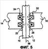 На Фиг.5 схематически показано в разрезе сварочное зажимное приспособление 14, многослойные упаковочные материалы 10, 12, контрпластина 16 и магнитные поля в зоне сварки. Из-за разреза проводник 24 сварочного зажимного приспособления 14 и проводник 32 контрпластины 16 каждый показаны как два круга. В кругах показано мгновенное направление тока. Стрелки показывают линии магнитного поля, и можно видеть, что основные линии поля около многослойных упаковочных материалов 10, 12 по существу параллельны плоскости 36 многослойных упаковочных материалов 10, 12. Далее, можно видеть, что вкладом контрпластины 16 является усиление магнитного поля, создаваемого сварочным зажимным приспособлением 14. Стрелки, представляющие магнитное поле от контрпластины 16, также по существу параллельны плоскости 36 многослойных упаковочных материалов 10, 12 и идут в том же направлении, что и линии магнитного поля от сварочного зажимного приспособления 14.