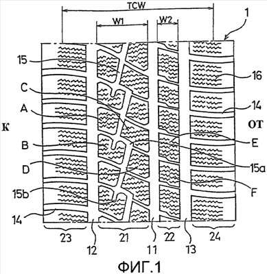 На фиг.1 показан рисунок протектора пневматической шины для использования на обледенелой и заснеженной дороге согласно варианту осуществления настоящего изобретения. Пневматическая шина согласно настоящему изобретению предназначена для ее установки на транспортное средство так, что обозначенная сторона шины должна быть обращена наружу от транспортного средства. На фиг.1 “К” обозначает сторону, обращенную к центру транспортного средства, тогда как “ОТ” обозначает другую сторону шины, обращенную наружу от транспортного средства.