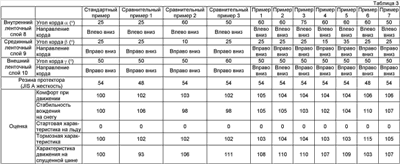 В шинах, установленных на описанном выше автомобиле, давление в переднем колесе со стороны водителя было снижено до нуля (0 кПа). Затем состояние автомобиля в движении наблюдалось во время, когда автомобиль стартовал на испытательном треке с обледеневшим дорожным покрытием. Шина была, таким образом, оценена по стартовой характеристике. Результаты оценки показаны индексами, где оценочный результат стандартной шины принят за 100. Чем больше индекс, тем лучше шина по стартовой характеристике.