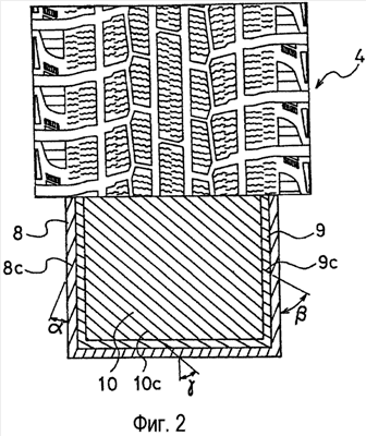 Как показано на Фиг.2, в настоящем изобретении поверхность опорной части 4 сформирована в виде блочной структуры, имеющей большое количество организованных блоков. Кордовые углы , и кордов 8с, 9с и 10с, образующие три соответствующих ленточных слоя 8, 9 и 10 относительно направления по окружности, устанавливаются следующим образом. А именно, угол корда внутреннего ленточного слоя 8 устанавливается от 15° до 30°. Угол корда среднего ленточного слоя 9 устанавливается не меньше 40° и предпочтительно не больше 75°. Угол корда внешнего ленточного слоя 10 устанавливается от 35° до 70° и предпочтительно от 40° до 65°.