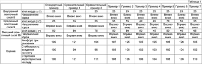 Эти два типа шин были оценены одним и тем же проверочным методом, как описано выше, в отношении комфорта вождения по обычным дорожным поверхностям и стабильности вождения при движении по заснеженным дорожным поверхностям во время, когда шина не пробита, а также стартовой характеристики на обледеневших дорожных поверхностях при движении на спущенной шине. Результаты оценки показаны в таблице 2 вместе с результатом стандартной шины (Стандартный Пример), показанным в таблице 1.