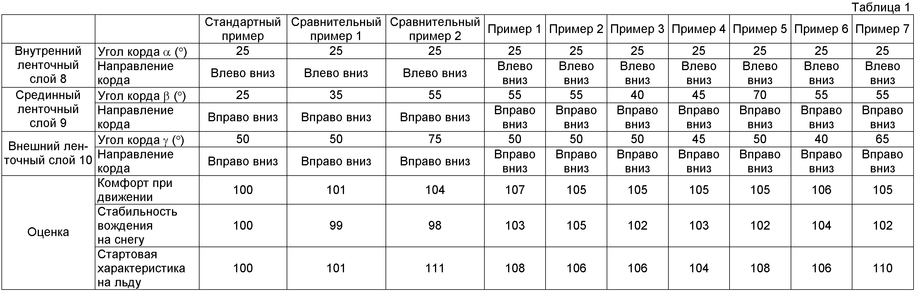 Стандартная шина (Стандартный Пример), сравниваемые шины (Сравнительные Примеры 1 и 2) и шины настоящего изобретения (Примеры с 1 по 7) были подготовлены. Эти шины имели размер 205/55R16 каждая, конструкцию, показанную на Фиг.1, и рисунок протектора, показанный на Фиг.2. Однако эти шины отличались одна от другой углами корда , и кордов соответствующих ленточных слоев 8, 9 и 10 относительно направления по окружности шины, а также направлением кордов относительно экваториальной плоскости шины, как показано в таблице 1.