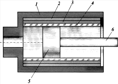 Указанное техническое решение имеет ряд преимуществ относительно первого. Однако возможности повышения его надежности и долговечности не исчерпаны. Кроме того, оно обладает существенным недостатком: разница коэффициентов теплового расширения стекла и металла при колебаниях температуры эксплуатации приводит к возникновению в зоне сопряжения втулки и корпуса, либо напряжений, либо вакуума, что значительно снижает надежность и долговечность гидроцилиндра. Другим недостатком прототипа является то, что рабочая поверхность стеклянной втулки имеет микропоры, ликвидация которых позволило бы повысить антифрикционные свойства рабочей поверхности.