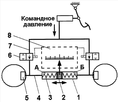 Смещение поршня 2 в левую А или правую Б полость цилиндра 1 в виде сигнала передается на встроенное бортовое устройство 8, на шкале которого в количественном выражении показывается величина разворачивающего момента, вызванного неравномерностью действия тормозов левого и правого колеса оси (осей) при торможении АТС.
