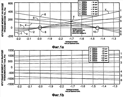 Фиг.1а представляет собой график зависимости крутящего момента на входе трансмиссии (нагружающий крутящий момент двигателя) от передаточного числа вариатора, для различных значений реактивного крутящего момента;