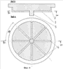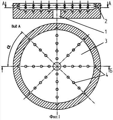На фиг.1, 2 показан пример конструктивного исполнения подпятника, состоящего из отверстия 1 под шкворень, упорной 2 и опорной 3 поверхностей, на которых расположены выемки 4 овальной формы (фиг.1) или в виде канавок (фиг.2), у которых угол , образованный краями двух рядом распложенных выемок в радиальном направлении, не превышает угла поворота тележки в кривых участках пути, т.е.   .