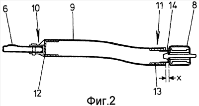 Фиг.2 показывает в сильном увеличении продольную балку 9 с креплениями 10, 11 для крепления к поперечным балкам 6, 8 из фиг.1. При этом видно, что продольная балка 9 на своих обоих концах связана с изготовленными из пластмассы переходными устройствами 12, 13. Переходные устройства 12, 13 являются частью крепления 10, 11 продольной балки 9 для крепления к поперечным балкам 6, 8. Переднее, обращенное в направлении движения переходное устройство 12 привинчено к выполненной в качестве охлаждающей поперечной балки поперечной балке 6. Заднее переходное устройство 13 надвинуто на привинченную к поперечной балке 8 подрамника 2 втулку 14. Оба переходных устройства 12, 13 имеют соответствующее внутреннему поперечному сечению продольной балки 9 наружное поперечное сечение. Насаженное на втулку 14 переходное устройство 13 имеет расстояние X от поперечной балки 8 подрамника 2. Тем самым крепление продольной балки 9 к задней поперечной балке 8 может смещаться на величину X. Продольная балка 9 выполнена в виде трубчатого элемента.