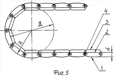 Гусеничная цепь, составленная из предлагаемых траков (фиг.5), которые содержат опорную поверхность 1, беговые дорожки 2, реборды 3 для направления опорных катков и проушины 4, при движении уборочной машины огибает направляющее колесо ее ходовой системы, при этом опорные поверхности 1 каждого трака будут лежать на радиусе