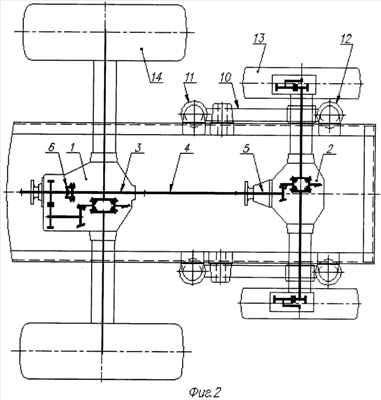 На фигуре 2 показан схематичный вид сверху на ведущий и подкатной мосты.