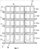 Фиг.2 изображает систему 20 помещений в соответствии с изобретением, в которой объемные блоки 21 в соответствии с изобретением жестко скреплены вместе и которая имеет пять блоков наверху друг у друга и три блока рядом друг с другом. Первый этаж 22a сначала прикрепляют непосредственно к палубе судна или к несущей опорной плите здания. Затем второй этаж 22b возводят непосредственно и только на первом этаже 22a. Третий этаж 22c, со своей стороны, возводят на втором этаже 22b, четвертый этаж 22d – на третьем этаже 22c, а пятый этаж 22e – на четвертом этаже 22d. Благодаря ее конструкции ячеистых панелей система 20 помещений представляет собой самонесущую конструкцию. В случае, если система 20 помещений является жилым многоквартирным домом, на ней можно устанавливать настил крыши или кровельное покрытие здания. В случае, если система 20 помещений является отделением кают судна, на ней можно устанавливать, например, открытую палубу или подобное сооружение. Каждый объемный блок 21 имеет балкон 9, парапетные ограждения которых на чертежах не показаны. Каждый объемный блок 21 имеет дверь 56 и окно 57, образованные в наружной стене 55.