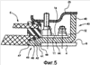 В отличие от рам 2 и 34 блоков 1 иллюминатора, показанных на фиг.3 и 4, в данном случае рама 40 иллюминатора содержит направленную вниз или наружу утолщенную часть 42 ниже наклонной (конической) опорной поверхности 41 для пакета 6 иллюминатора. Первая часть 43 рамы 40 иллюминатора, которая имеет в поперечном сечении примерно Г-образную геометрическую форму, аналогична конструкции рамы 2 иллюминатора, представленной на фиг.3, и направлена в целом перпендикулярно к внешней обшивке 4 конструкции фюзеляжа. Вторая часть 44 рамы 40 иллюминатора, опирающаяся на внутреннюю поверхность 5 внешней обшивки 4, имеет большую длину по сравнению с вариантом, представленным на фиг.3, так что одна краевая зона 45 с утолщенной частью 42 выступает в вырез 3 для иллюминатора.