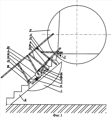На одном валу с роликом 19 закреплен ролик 16, который по диаметру больше ролика 19. Вращаясь, ролик 19 передает вращательное движение ролику 16, который с помощью троса 13 приводит в движение ролик 12, на котором закреплена стойка 20 внешней секцией складного поручня.