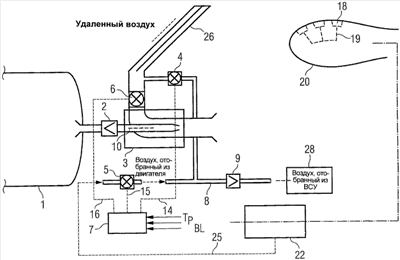 Система 26 каналов для текучей среды соединена с линией 8 сжатого воздуха через управляемый клапан 4 выдуваемого воздуха. Сама линия 8 сжатого воздуха соединена через управляемый клапан 5 отбора воздуха с линией 25 отбора воздуха, отходящей от соответствующей части двигателя 22 летательного аппарата. Клапан 5 отбора воздуха получает управляющие сигналы от блока 7 управления по линии 15 управления. Далее, линия 8 сжатого воздуха альтернативно или дополнительно соединена с компрессорной установкой 28 через предохранительный клапан 9, в качестве которого используется запорный клапан. Компрессорная установка 28 может быть компрессором, приводимым двигателем летательного аппарата, или автономным компрессором сжатого воздуха. Использование дополнительного компрессора в качестве источника сжатого воздуха для системы 26 каналов для текучей среды в дополнение к линии 25 отбора воздуха от двигателя 22 летательного аппарата имеет смысл для создания необходимого давления в каналах системы 26 при некоторых режимах работы двигателя 22, когда отбор воздуха от него не представляется возможным.