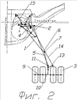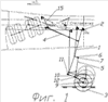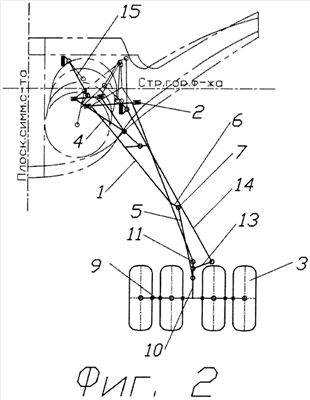 Соосно оси 9 колес тележки установлен рычаг 10, ориентированный вперед по направлению полета самолета и расположенный в плоскости вращения колес. На конце рычага 10 расположен шарнир 11 соединения со стойкой 1. Между шарниром 11 соединения со стойкой 1 и осью колес на рычаге 10 расположен шарнир 12 крепления штока амортизатора. Между шарнирами 11 и 12 рычага 10 на нем жестко закреплен поводок 13, расположенный в плоскости, перпендикулярной плоскости расположения рычага 10 (и плоскости вращения колес). Устройство снабжено тягой 14, шарнирно связанной с поводком 13 и фюзеляжем.